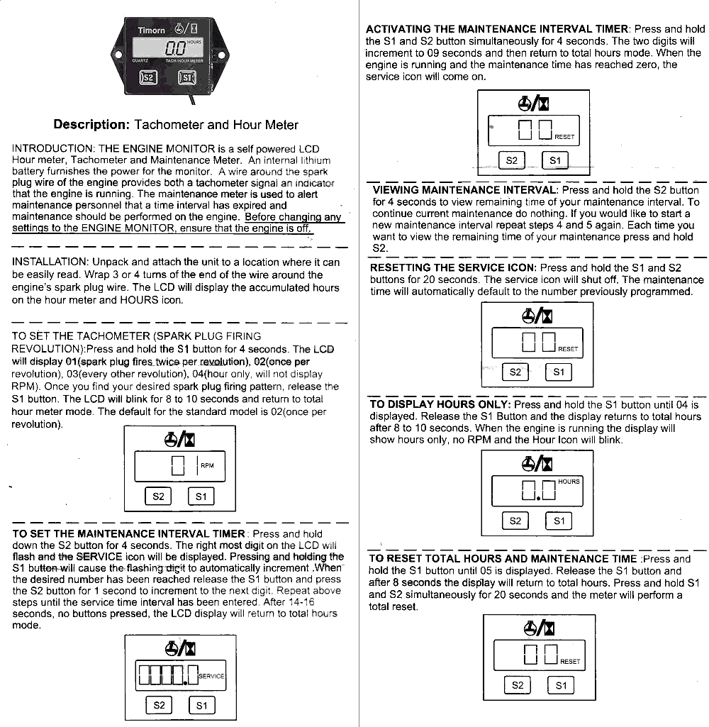 S1 and S2 buttons. If tachometer does not turn on automatically as soon